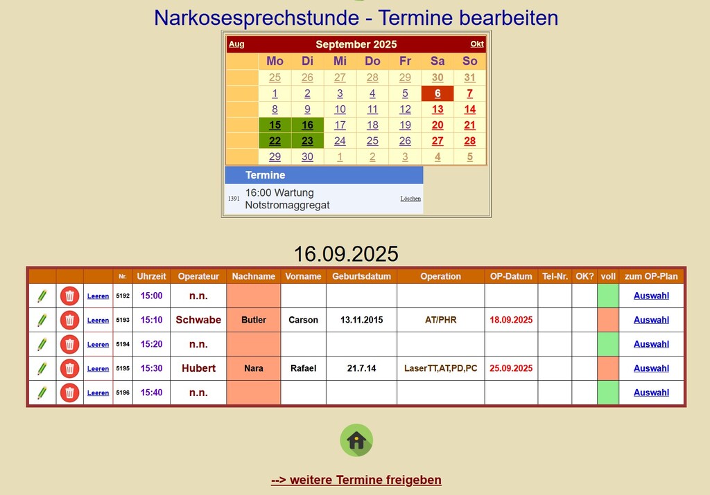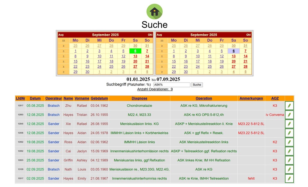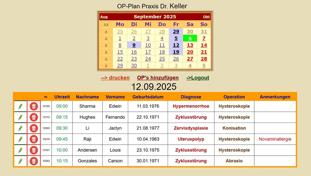 • die bisherigen Einträge (Name, Geb.Datum, Operateur, Diagnose, OP des jeweiligen OP-Tages werden übernommen